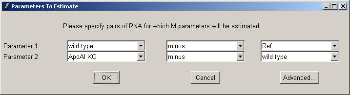 The interface for choosing contrast(s) is similar to the interface for choosing parameters for the linear model. You can click on the "Advanced" button if you want to enter a contrasts matrix directly. One difference is that in the simpler (non-matrix) interface, the user is allowed to use "plus" or "minus" to form a linear combination of two parameters, whereas the interface for choosing parameters only allowed a "minus" between the two RNA types. In this case we will add our two parameters to form the contrast KOvsRef.