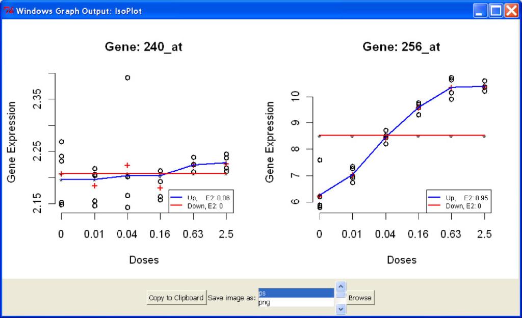 To explore the expression of the genes, the package provides a submenu IsoPlot from Plots menu. This feature displays the data points, sample means at each dose and an isotonic regression line.