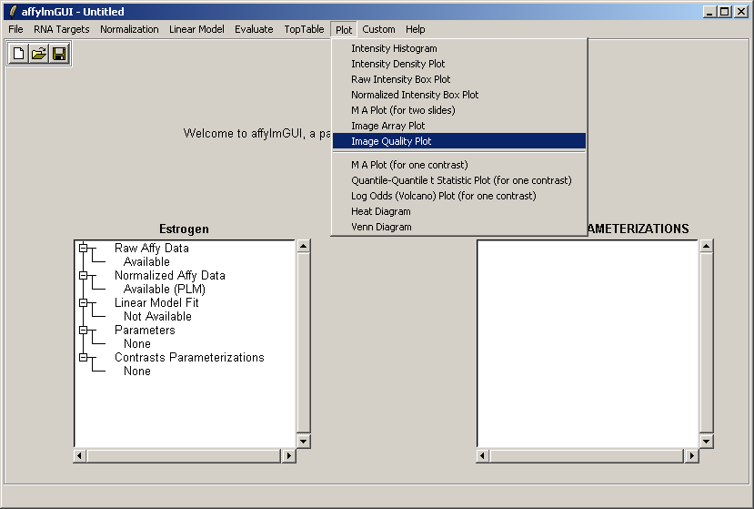 The main window of affylmGUI is shown above. From the File menu, click on "New" to begin a new analysis.