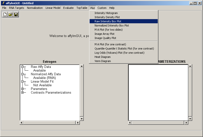 The left status window now reflects the fact that normalization is complete. For users who are familiar with some R commands, the raw and normalized data objects are available as "RawAffyData" and "NormalizedAffyData" in the "Evaluate R Code" window, found in the "Evaluate" menu.