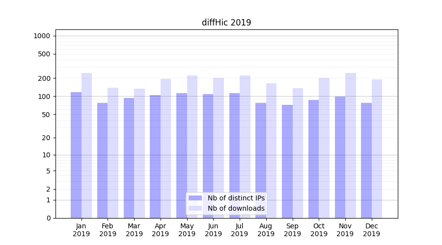 Number of downloads for software package diffHic, year by year, from 2025 back to 2014 (years with no downloads are omitted):