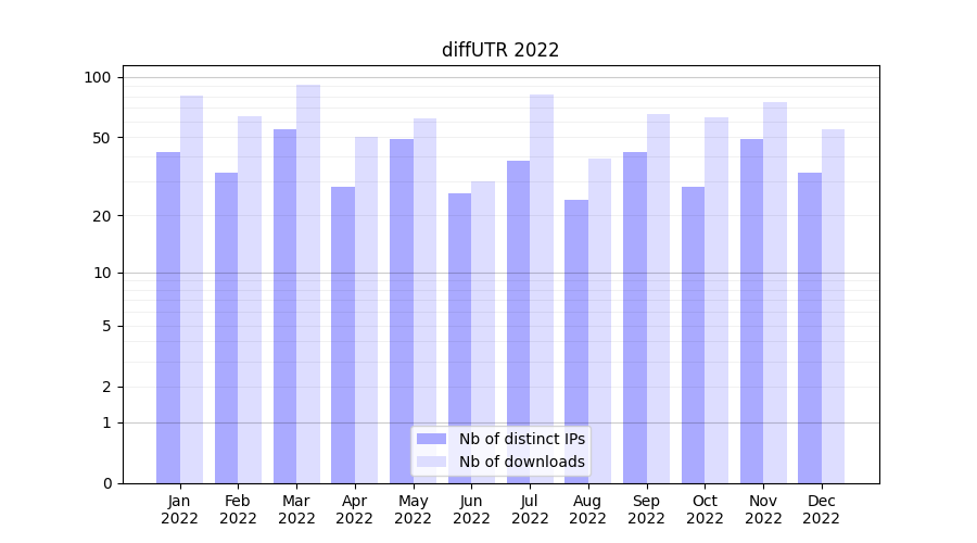 Number of downloads for software package diffUTR, year by year, from 2025 back to 2014 (years with no downloads are omitted):