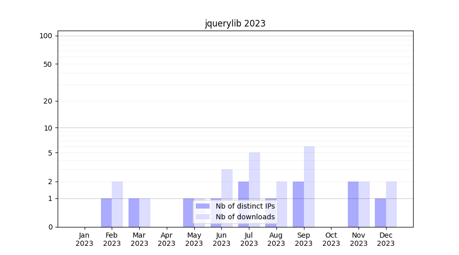 Number of downloads for software package jquerylib, year by year, from 2025 back to 2014 (years with no downloads are omitted):