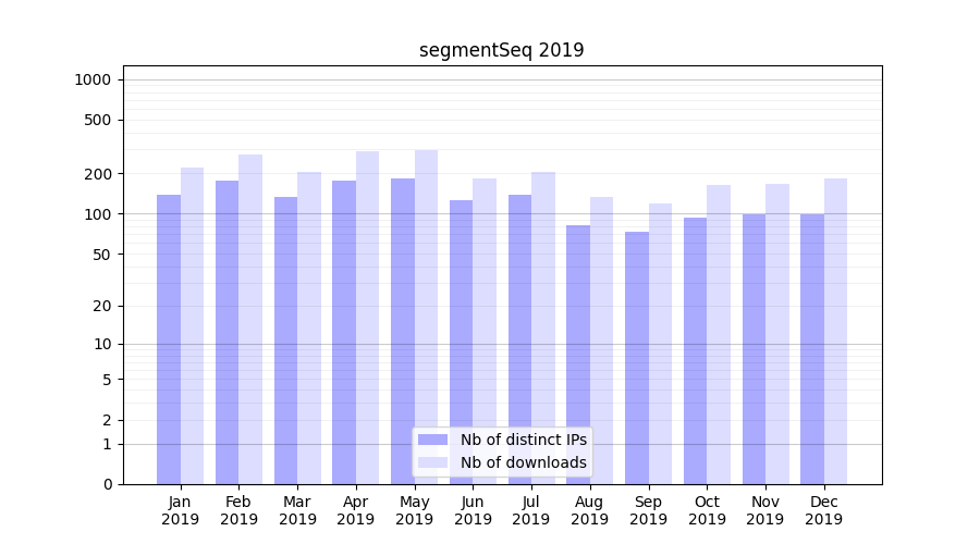 Number of downloads for software package segmentSeq, year by year, from 2025 back to 2014 (years with no downloads are omitted):
