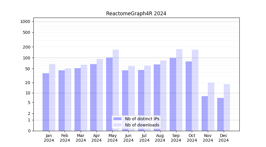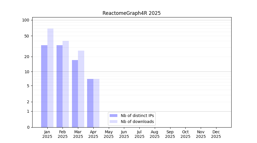 Number of downloads for software package ReactomeGraph4R, year by year, from 2025 back to 2014 (years with no downloads are omitted):