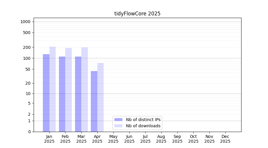 Number of downloads for software package tidyFlowCore, year by year, from 2025 back to 2014 (years with no downloads are omitted):