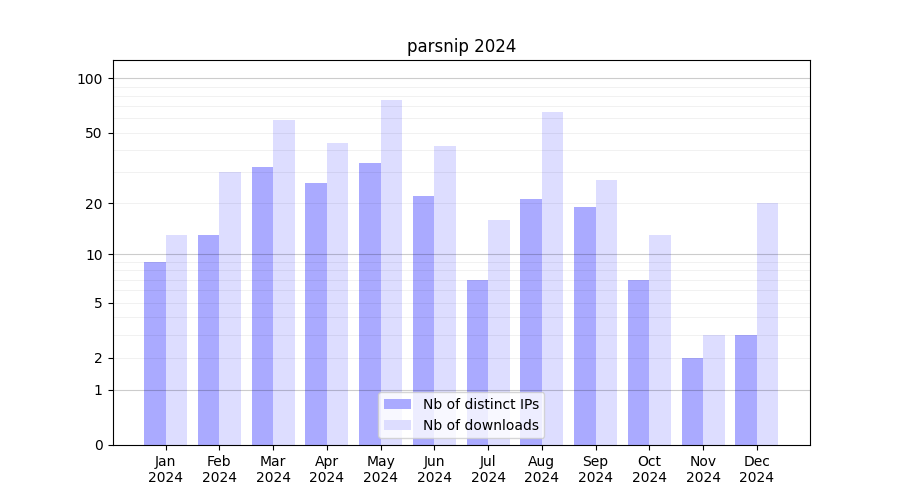 Number of downloads for annotation package parsnip, year by year, from 2025 back to 2014 (years with no downloads are omitted):