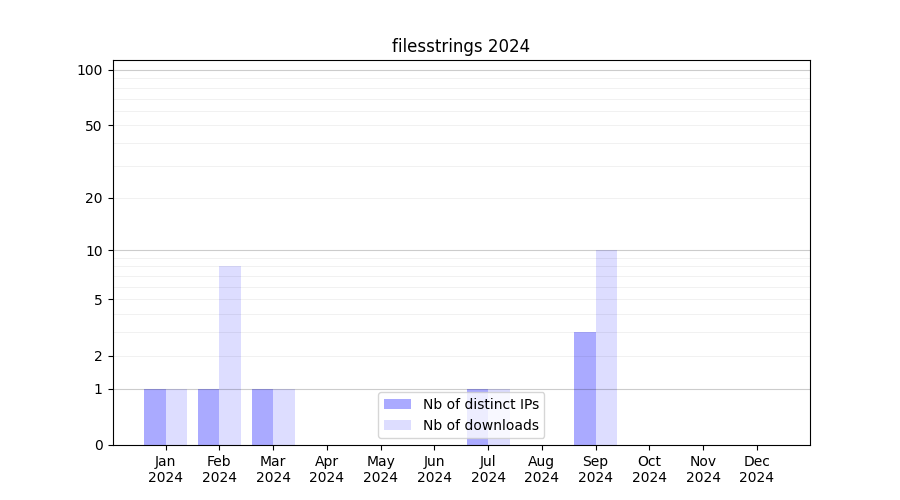 Number of downloads for workflow package filesstrings, year by year, from 2025 back to 2015 (years with no downloads are omitted):