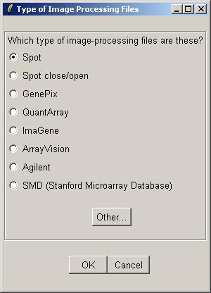 Now you can open a GAL (GenePix Array List) file, an RNA Targets file (listing the hybridizations), and a Spot Types file.