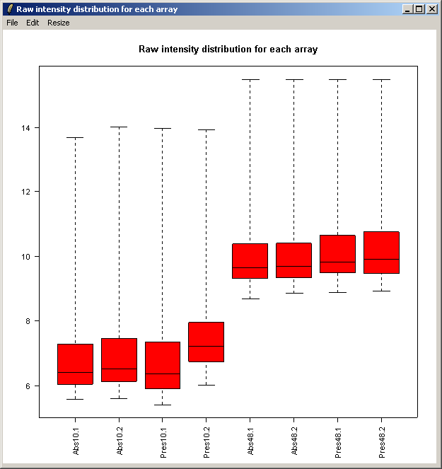 The resulting plot is shown above. Next we will show the same intensity box plot using normalized data. The normalization will remove effects seen in large proportions of the data (in this case a time effect is obvious) while still preserving effects seen in small proportions of the data. We hope that we will find a small number of genes with significantly different expression levels between the non-replicate arrays and that these genes do not make up a large enough proportion to seriously question the assumptions of normalization. Generally normalization of microarray data does more good than harm, because it removes artificial biases due to the technology rather than the biology.