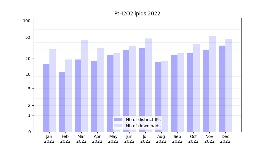 Number of downloads for experiment package PtH2O2lipids, year by year, from 2025 back to 2014 (years with no downloads are omitted):