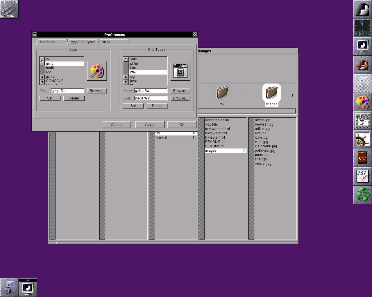 La ventana Preferences tiene tres partes: variables, aplicaciones y tipos de ficheros, discos. En la primera parte pueden elegir imágenes por defecto, los ejecutables y las características de la pantalla. En la segunda, desde la parte izquierda, se seleccionan las aplicaciones que quieren arrancar a partir de FSV y desde la parte derecha, los tipos de ficheros abiertos con las diferentes aplicaciones. Por ejemplo, si en la parte izquierda tienen los ejecutables Netscape y Nedit, en la derecha pueden especificar que los ficheros .html serán visualizados con Netscape y editados con Nedit. En la tercera, pueden añadir las unidades removibles como el CD-RROM o unidades ZIP para poder montarlos (o desmontarlos, o eyectarlos) a partir de FSV.