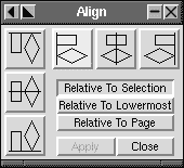 Align : Align one or more objects relative to each other (by edge, top or centre), to the page, or to a selection.