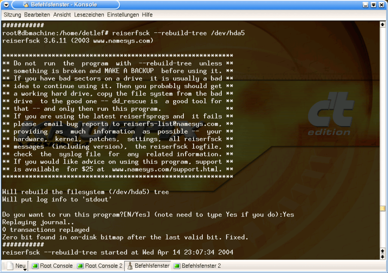 I get the good old 'replaying journal' message. It's this Good Samaritan that makes the restore possible - a kind of table of contents for all sub-partitions. Two lines later, reiserfsck comes across a faulty null bit and ... corrects it.