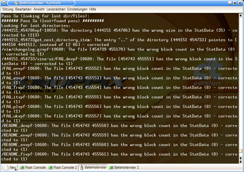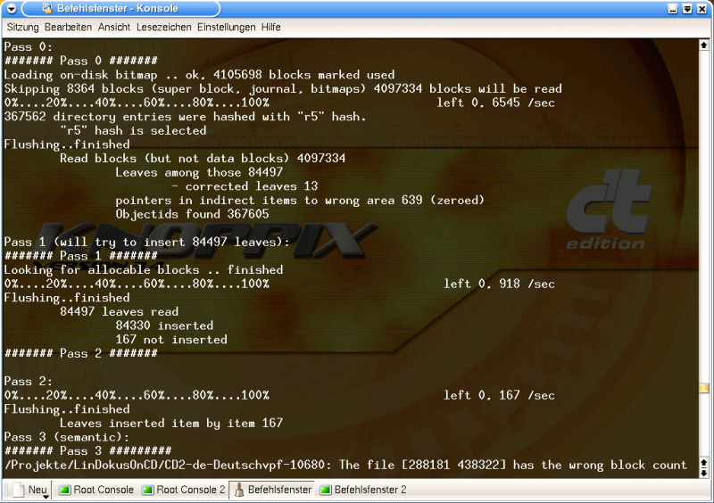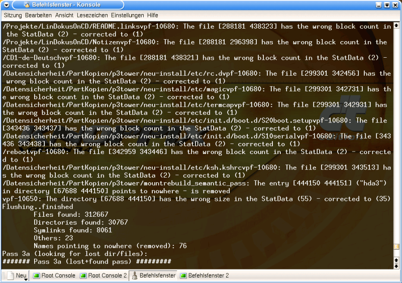 In Pass 3 I get inundated with data error messages. I recognise the files, they are from the SuSE documentation copy process. That proves that something went wrong with that specific copy process. Was it the KDE 3 conqueror or a bug in ReiserFS?