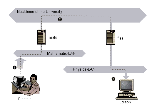 Because Einstein's software (rlogin, telnet, ftp etc.) can't send data (data packets) directly to Edison, which is found on a physically independent network, you have to rely on the gateway to transport the packets to the corresponding destination. In other words, the gateway "math" sends the packets to the gateway "fisa", that has the same function the the physics network. The transfer goes through the university backbone and "fisa" finally delivers the data to Edison. This scheme of data transmission to a remote host (computer on the network) is call Routing and the data or packets of data are called datagrams.