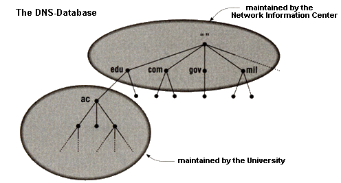 In DNS, the complete domain name is a sequence of tags, beginning with the domain until the root, separating the tags with periods "." (for example: einstein.mathematics.ac.edu). Allowing each domain to be administrated by a different organization. Each organization can divide their domain in various subdomains, whose administration can be carried out by other organizations