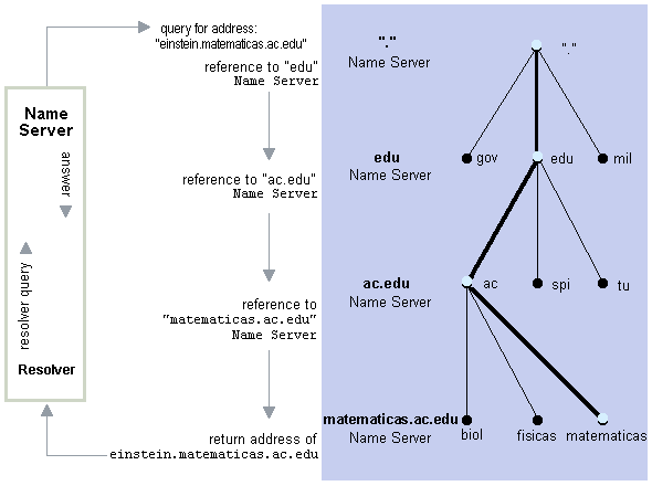 The Name Server is a program that forms the server part of the client-server mechanism of DNS. The Name Servers have information about a given segment of the database, which it makes available for clients, named Resolvers. Many times the Resolvers only consist of library routines, that create queries and send them to the Name Server through the network.