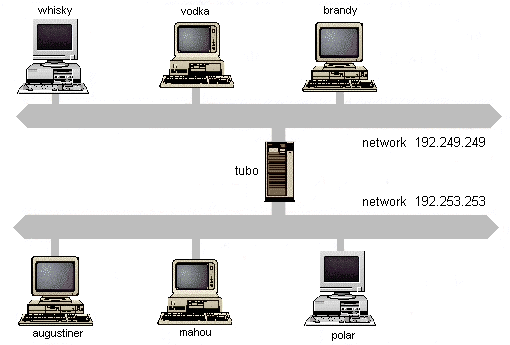 Our fictitious domain is for a beverage wholesaler. The company "Alcomato Distributions", specializing in beer and liquor, was given the domain name "alcomat.com" after having contacted NIS. Alcomato Distributions has two Ethernets with the network numbers 192.249.249 and 192.253.253 (Figure 6).