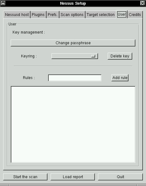 É também possível, definir um só utilizador sem nenhuma regra. Se deseja que vários utilizadores possam correr o nessusd, terá de ter muita precaução com o que lhes permite fazer. Não pode deixar toda a gente fazer tudo na sua rede, ou pode ?