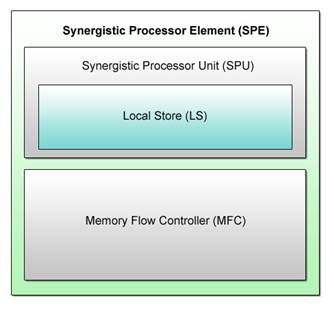 The LS refers to a 256KB memory associated with each SPU. It is the only memory that can be referenced directly from the SPU. A special controller described as the MFC in the next paragraph must be used to make the main memory and LS memories of other SPUs accessible.