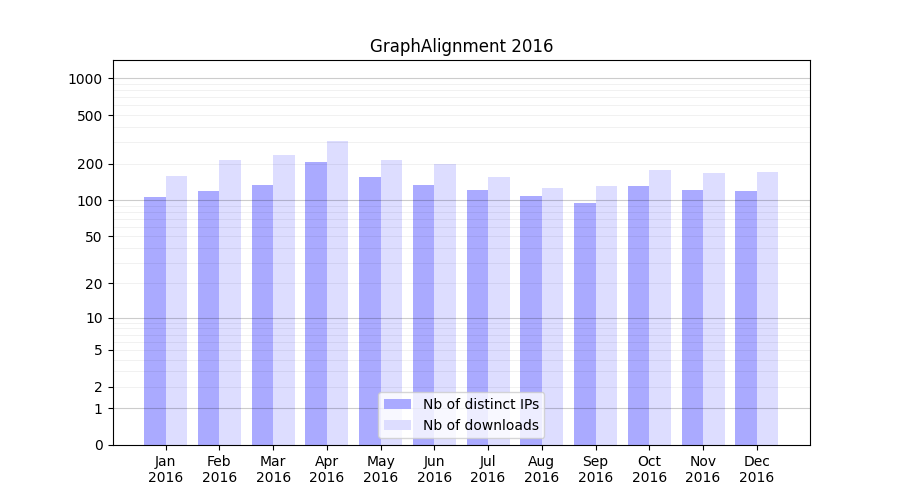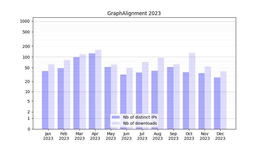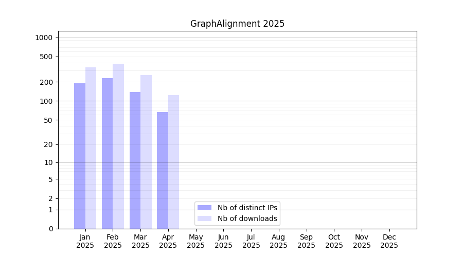 Number of downloads for software package GraphAlignment, year by year, from 2025 back to 2014 (years with no downloads are omitted):