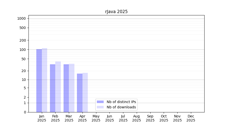 Number of downloads for software package rJava, year by year, from 2025 back to 2014 (years with no downloads are omitted):