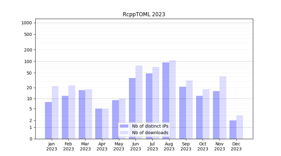 Number of downloads for annotation package RcppTOML, year by year, from 2025 back to 2014 (years with no downloads are omitted):