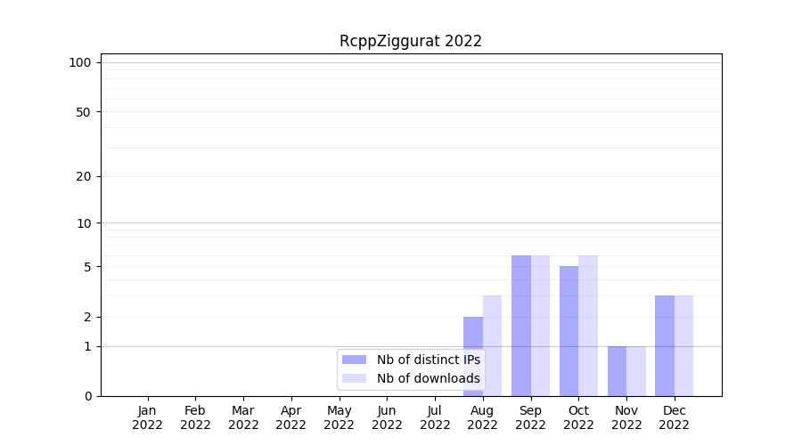 Number of downloads for annotation package RcppZiggurat, year by year, from 2025 back to 2014 (years with no downloads are omitted):