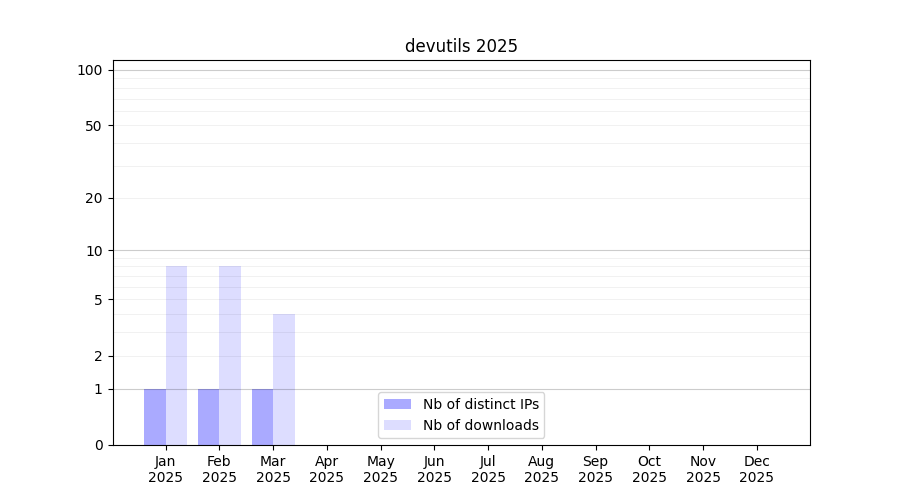 Number of downloads for annotation package devutils, year by year, from 2025 back to 2014 (years with no downloads are omitted):