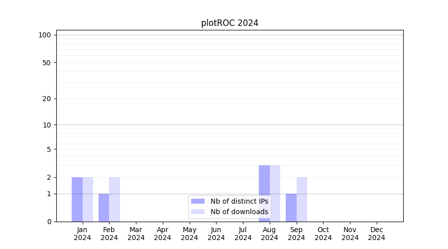 Number of downloads for annotation package plotROC, year by year, from 2025 back to 2014 (years with no downloads are omitted):
