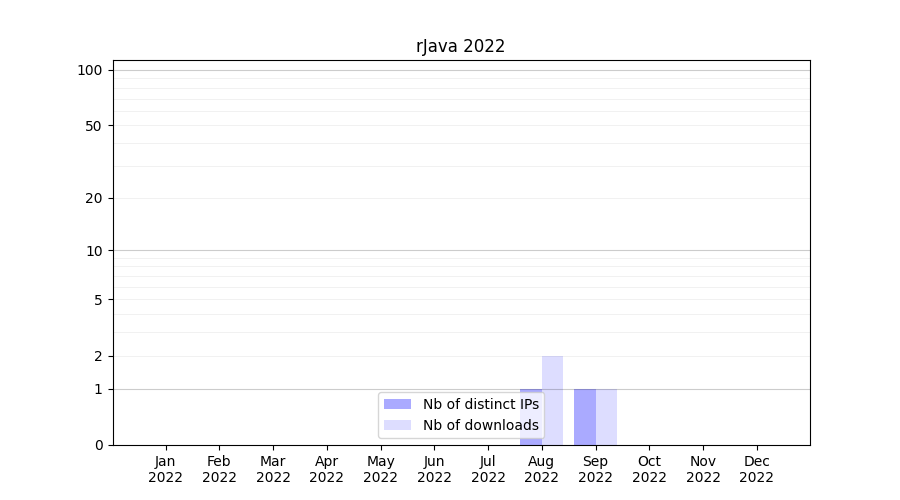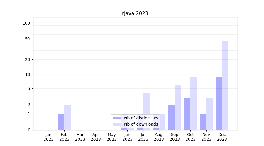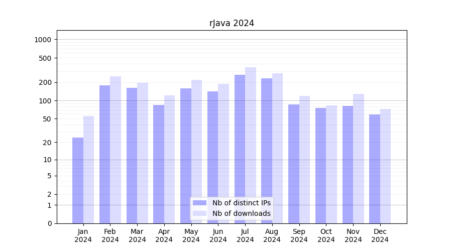 Number of downloads for annotation package rJava, year by year, from 2025 back to 2014 (years with no downloads are omitted):