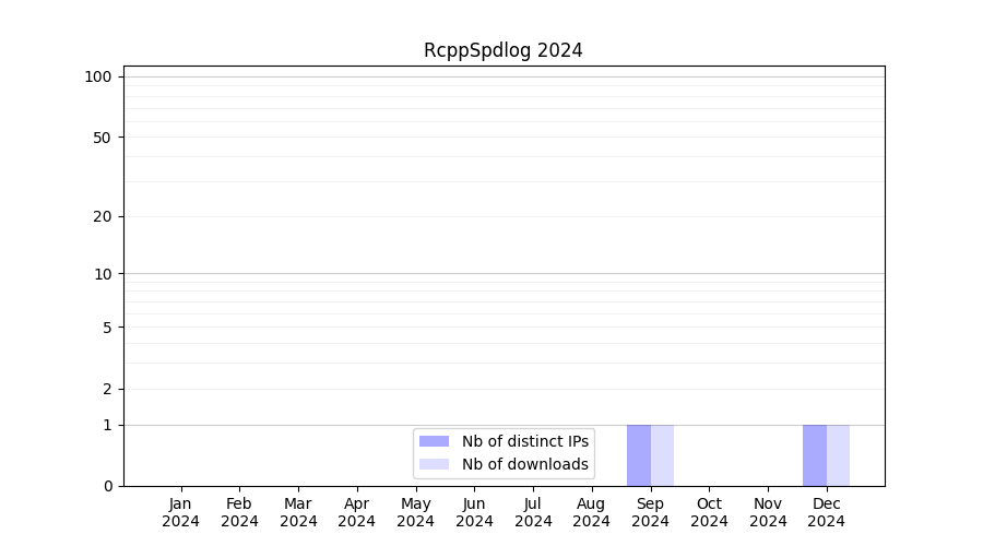 Number of downloads for experiment package RcppSpdlog, year by year, from 2025 back to 2014 (years with no downloads are omitted):
