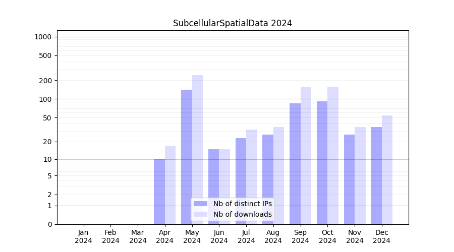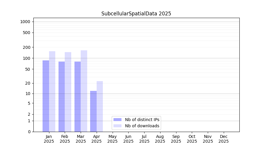 Number of downloads for experiment package SubcellularSpatialData, year by year, from 2025 back to 2014 (years with no downloads are omitted):