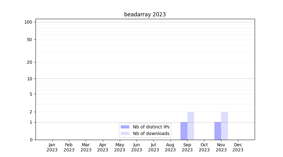 Number of downloads for experiment package beadarray, year by year, from 2025 back to 2014 (years with no downloads are omitted):