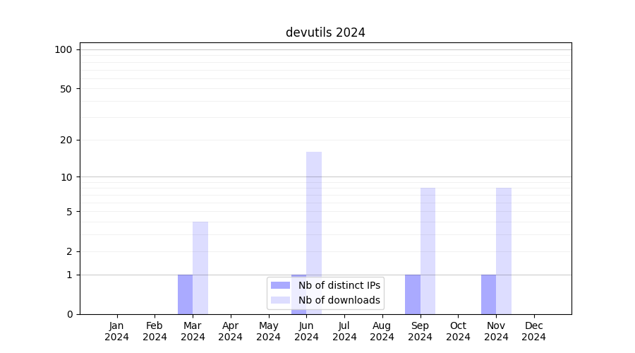 Number of downloads for experiment package devutils, year by year, from 2025 back to 2014 (years with no downloads are omitted):