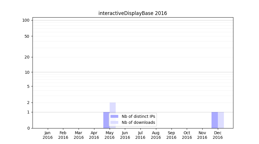 Number of downloads for experiment package interactiveDisplayBase, year by year, from 2025 back to 2014 (years with no downloads are omitted):