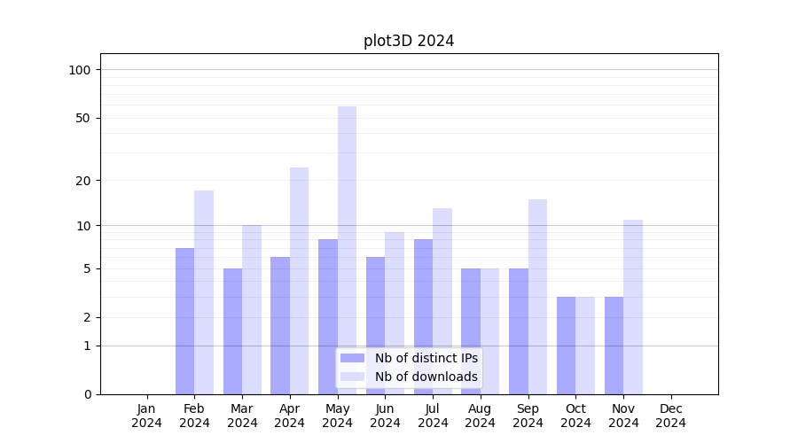 Number of downloads for experiment package plot3D, year by year, from 2025 back to 2014 (years with no downloads are omitted):