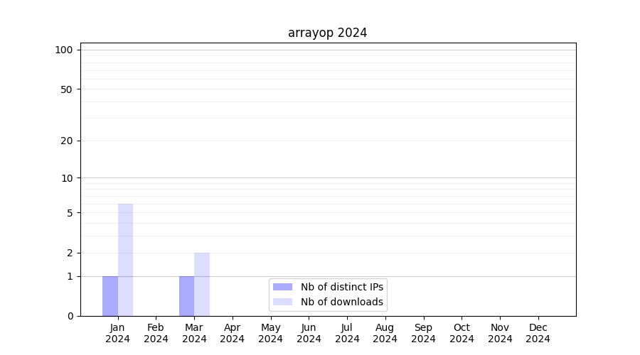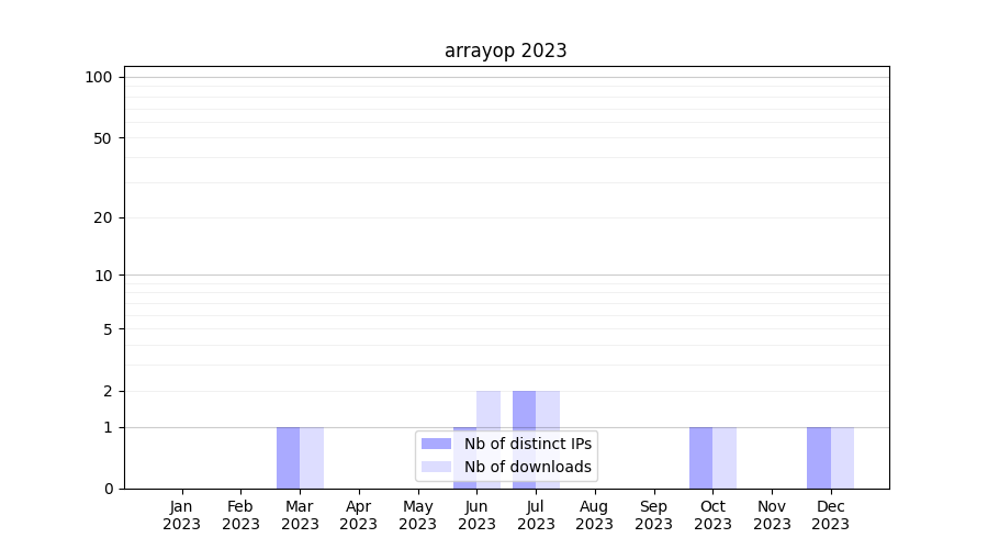 Number of downloads for workflow package arrayop, year by year, from 2025 back to 2015 (years with no downloads are omitted):