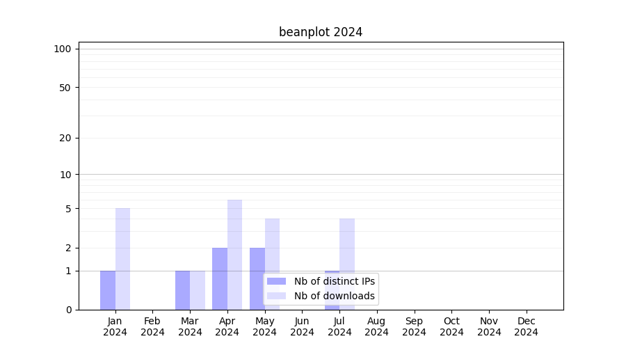 Number of downloads for workflow package beanplot, year by year, from 2025 back to 2015 (years with no downloads are omitted):