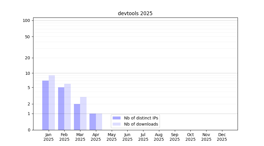 Number of downloads for workflow package devtools, year by year, from 2025 back to 2015 (years with no downloads are omitted):