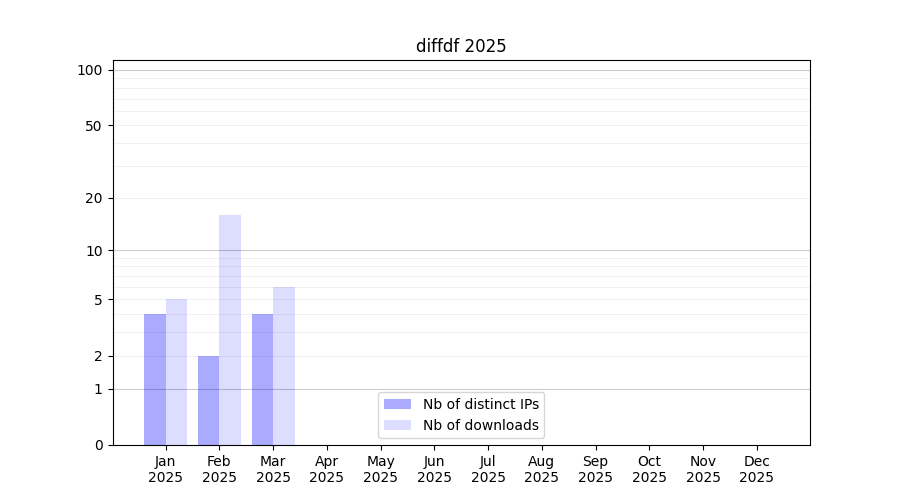 Number of downloads for workflow package diffdf, year by year, from 2025 back to 2015 (years with no downloads are omitted):