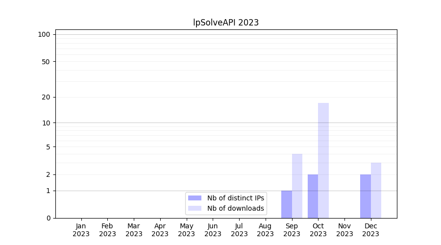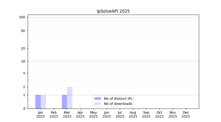 Number of downloads for workflow package lpSolveAPI, year by year, from 2025 back to 2015 (years with no downloads are omitted):