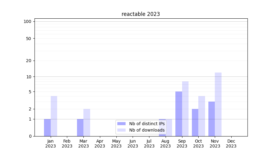 Number of downloads for workflow package reactable, year by year, from 2025 back to 2015 (years with no downloads are omitted):