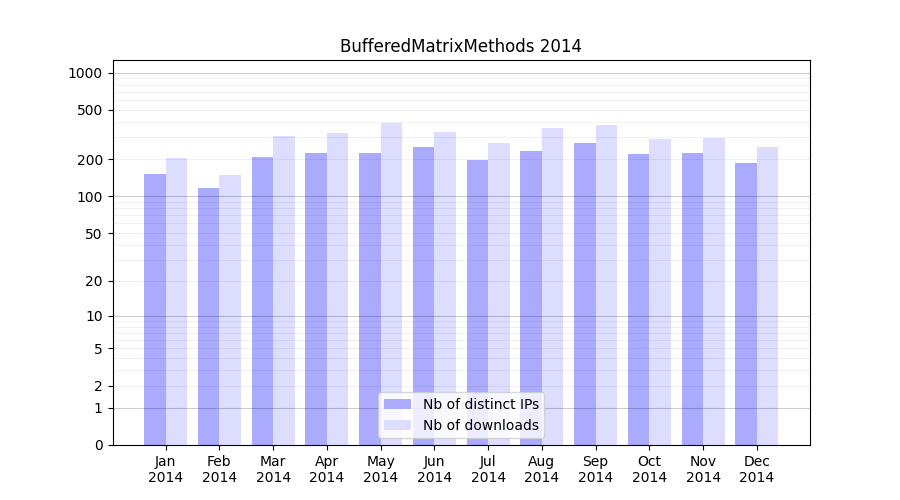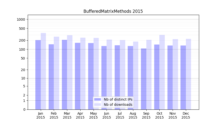 Number of downloads for software package BufferedMatrixMethods, year by year, from 2025 back to 2014 (years with no downloads are omitted):
