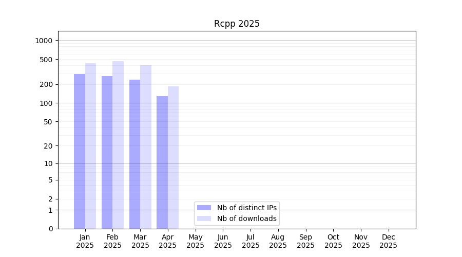 Number of downloads for software package Rcpp, year by year, from 2025 back to 2014 (years with no downloads are omitted):