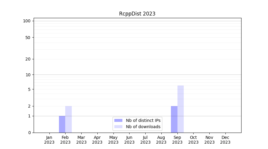 Number of downloads for software package RcppDist, year by year, from 2025 back to 2014 (years with no downloads are omitted):