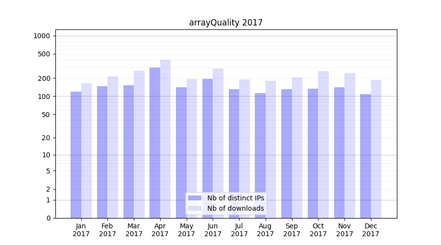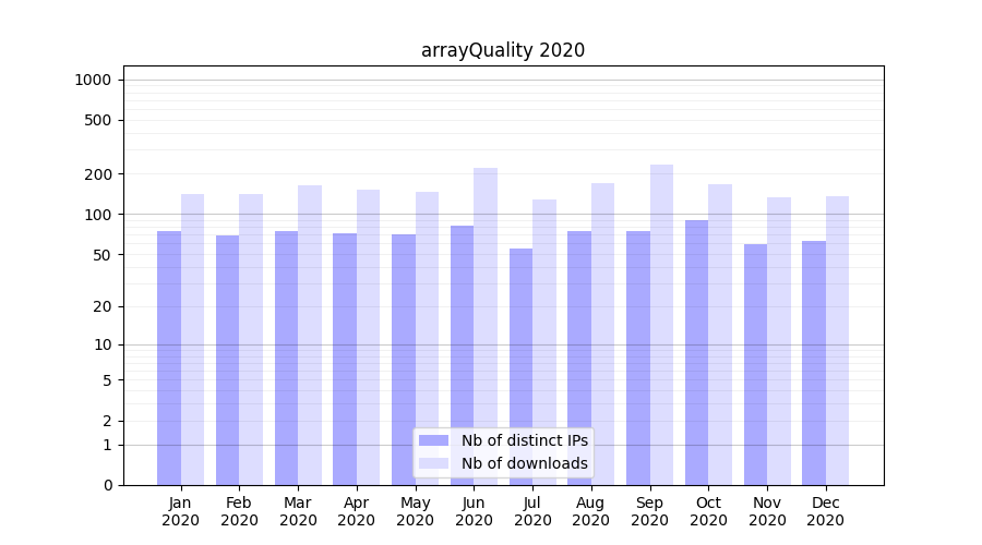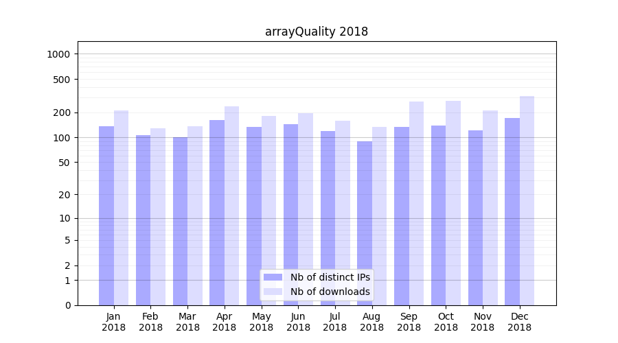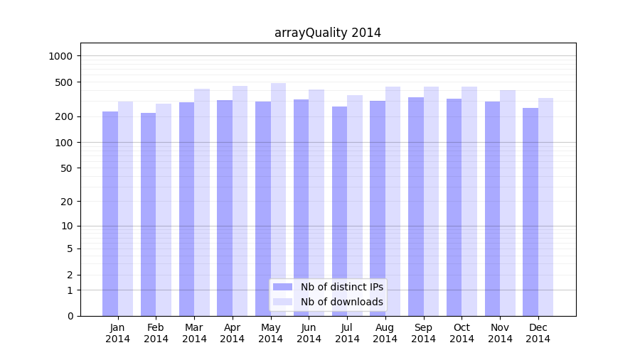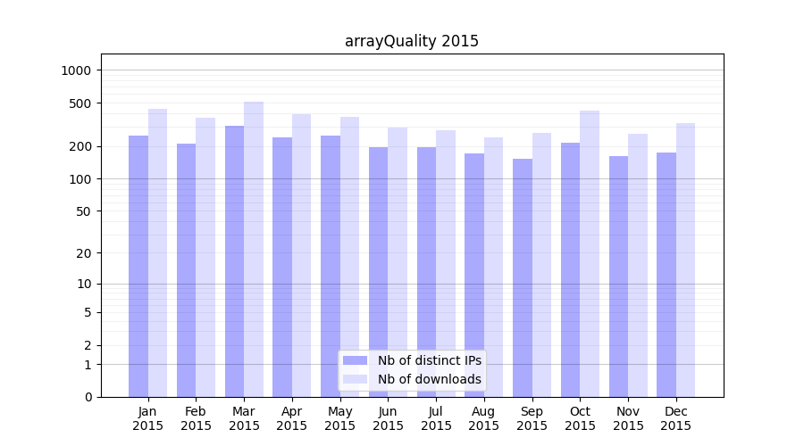 Number of downloads for software package arrayQuality, year by year, from 2025 back to 2014 (years with no downloads are omitted):