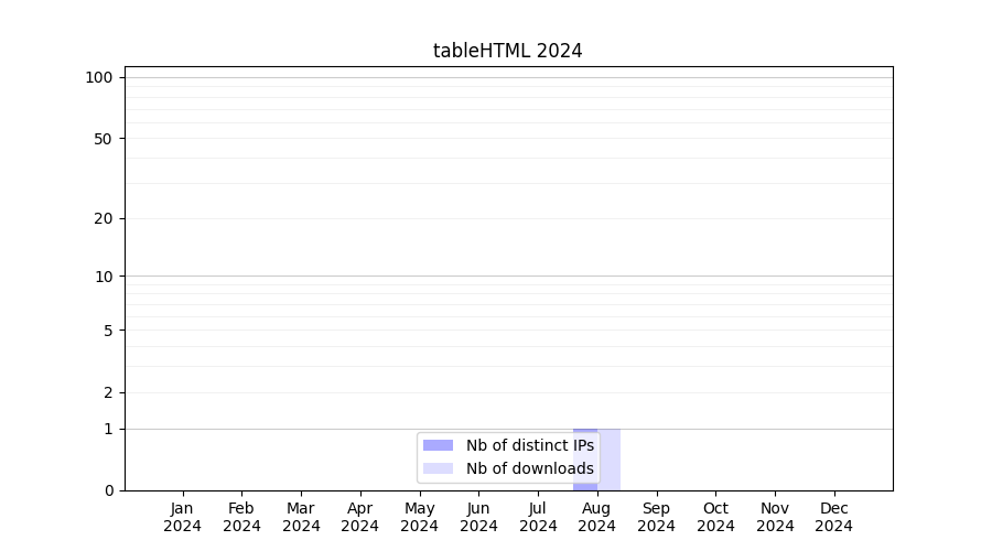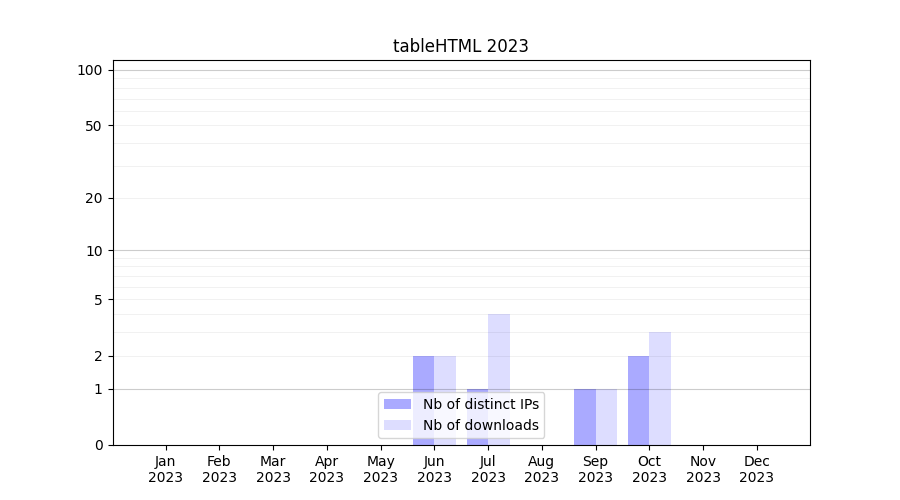 Number of downloads for software package tableHTML, year by year, from 2025 back to 2014 (years with no downloads are omitted):