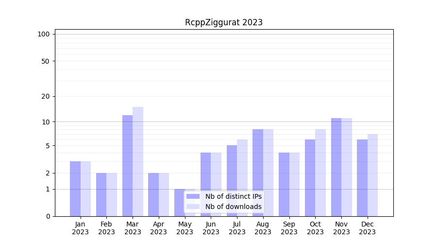 Number of downloads for annotation package RcppZiggurat, year by year, from 2025 back to 2014 (years with no downloads are omitted):